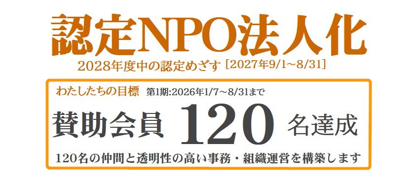 NPO法人として拠点が決まるまで、自宅を仮事務所としております。 ご不便をおかけしますがよろしくお願いいたします。 |